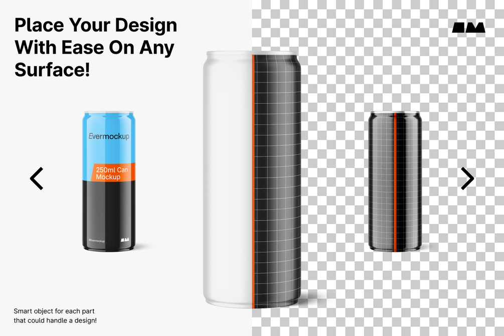 250ml can mockup to help you display your product properly. Comes in Glossy, Matte and Metallic in addition to Bronze and Gold, with the ability to customize each element and easily place your design via smart object.