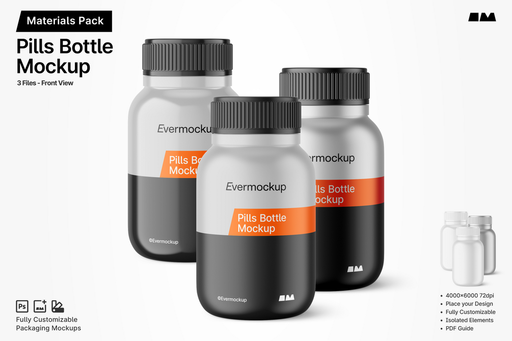 You will get a Front view of Pills Bottle Mockup. Comes in Glossy, Matte and Matte Metallic