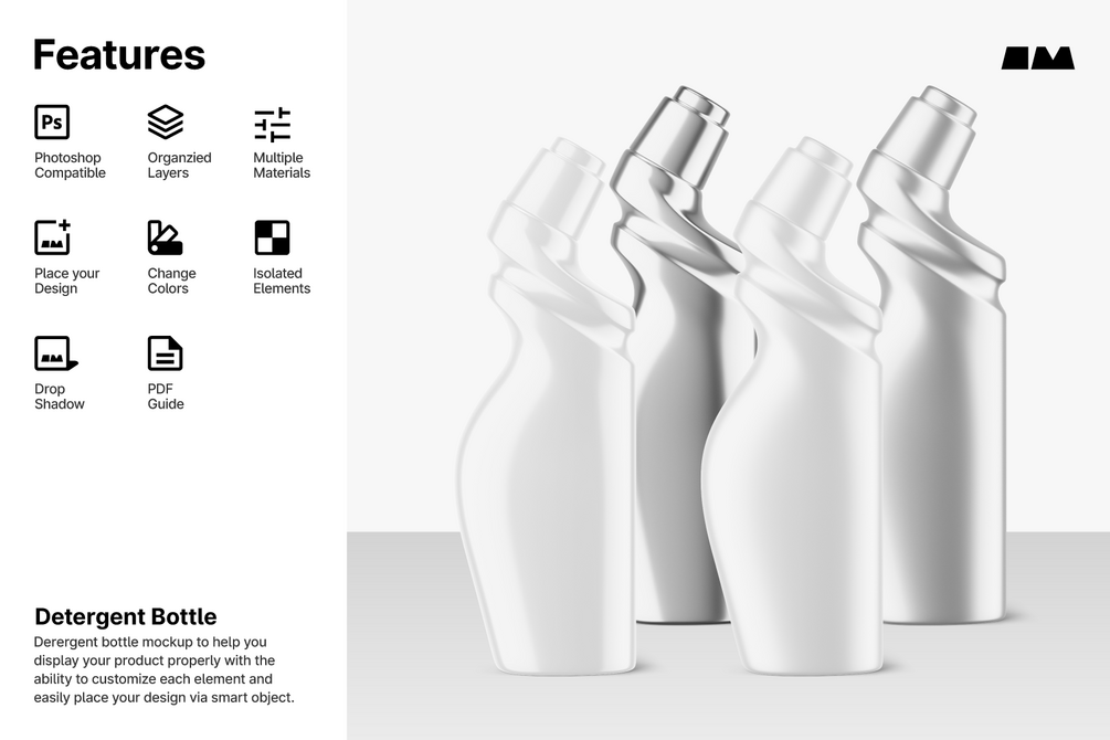 Detergent bottle mockup to help you display your product properly. Comes in Glossy, Matte, Metallic and Matte Metallic with the ability to customize each element and easily place your design on both label and bottle via smart object.