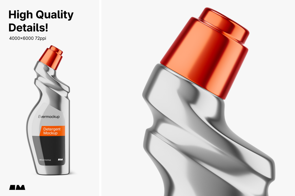 You will get a Front view of Detergent Bottle Mockup. Comes in Glossy, Matte, Metallic and Matte Metallic.