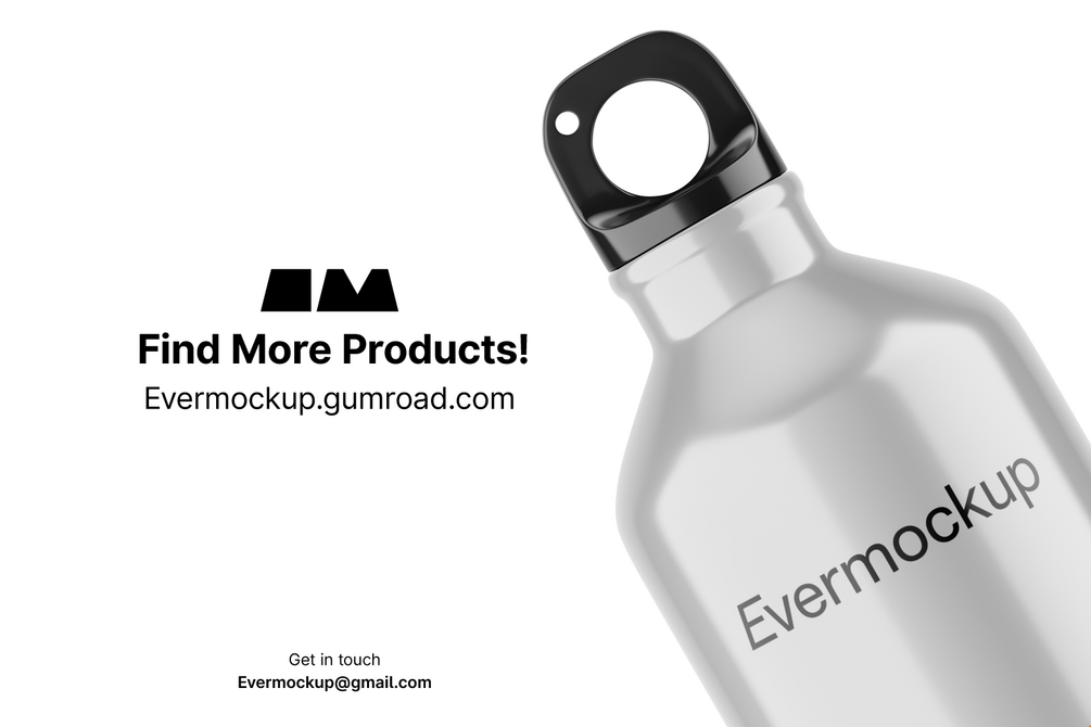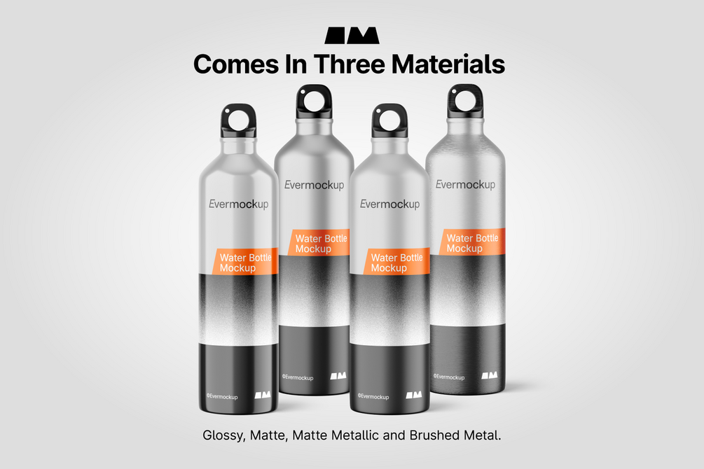 You will get a Front view of Water Bottle Mockup. Comes in Glossy, Matte, Matte Metallic and Brushed Metal.