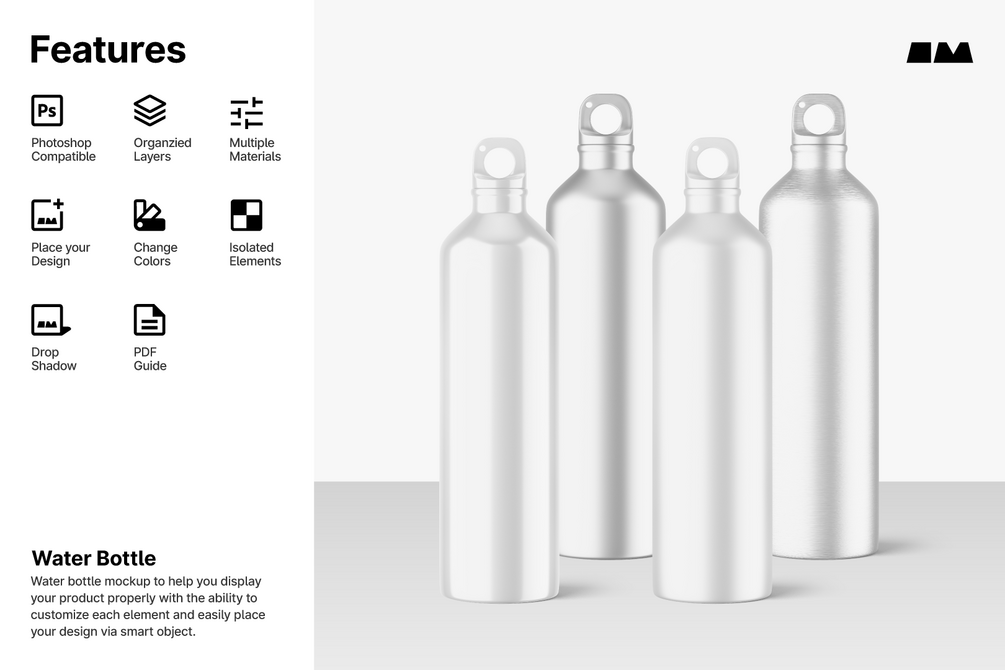 Water bottle mockup to help you display your product properly. Comes in Glossy, Matte, Matte Metallic and Brushed Metal, with the ability to customize each element and easily place your design on both label and bottle via smart object.
